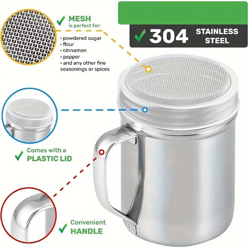 Cernidor de Polvo de Malla Fina para tus postres - Herramienta de Cocina Duradera y Fácil de usar para una Dispensación Precisa de Azúcar, Acabado Metálico Elegante, Material de Fácil Limpieza.