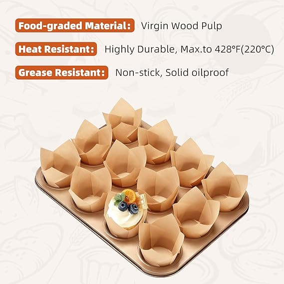 Tulipanes color natural (kraft) para cupcakes para hornear tazas, papel pergamino de primera calidad, para magdalenas a prueba de grasa.