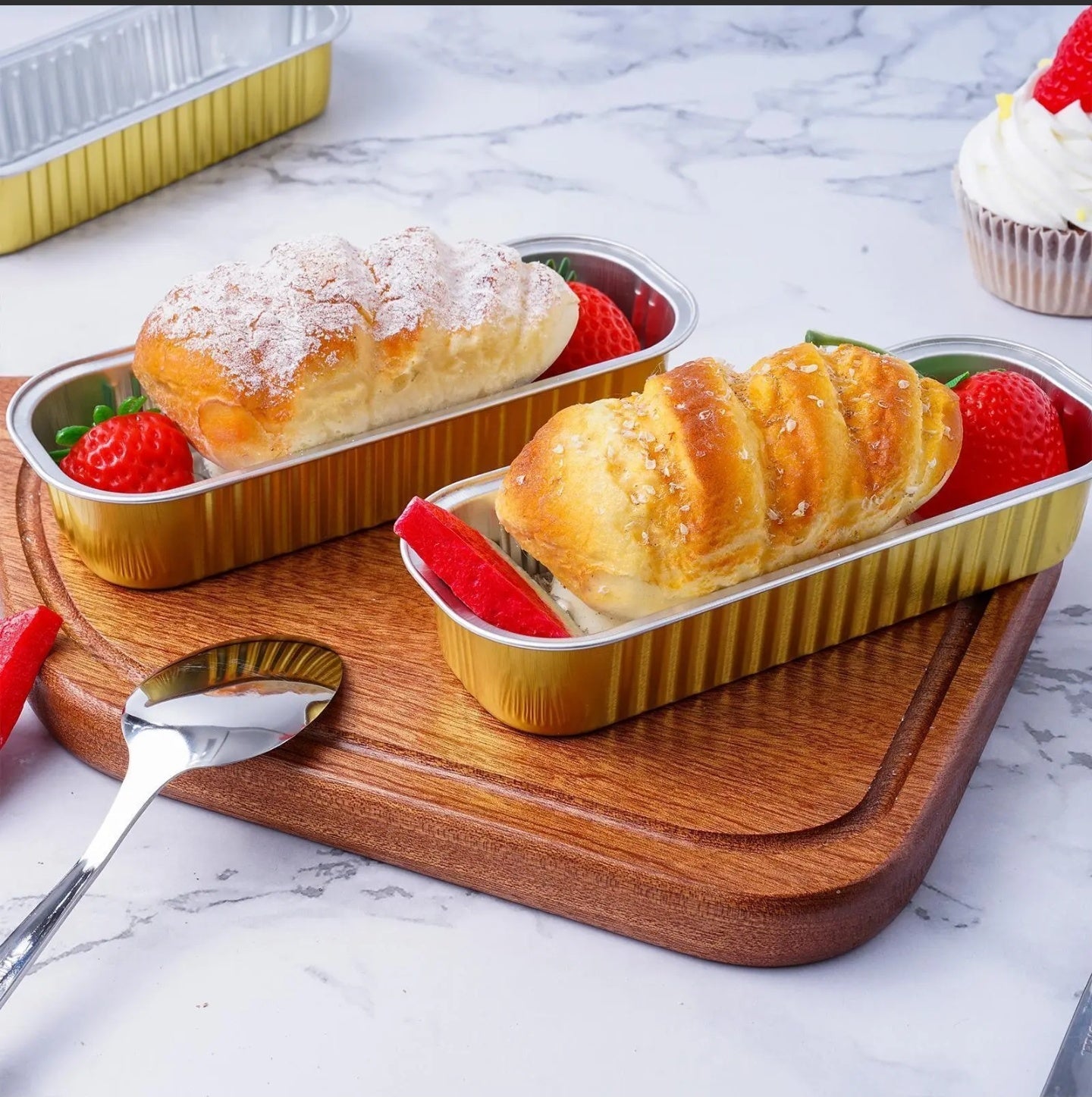 Estos mini moldes chulísimos están hechos de aluminio grueso apto para uso alimentario, se pueden colocar en el horno. Los moldes para hornear rectangulares son aptos para horno y microondas. Estos mini moldes pueden soportar temperaturas de hasta 250 ℃/482 ℉, debe dejar que los moldes se enfríen antes de colocar las tapas. (NOTA: ¡Las tapas transparentes no son resistentes al calor!)
